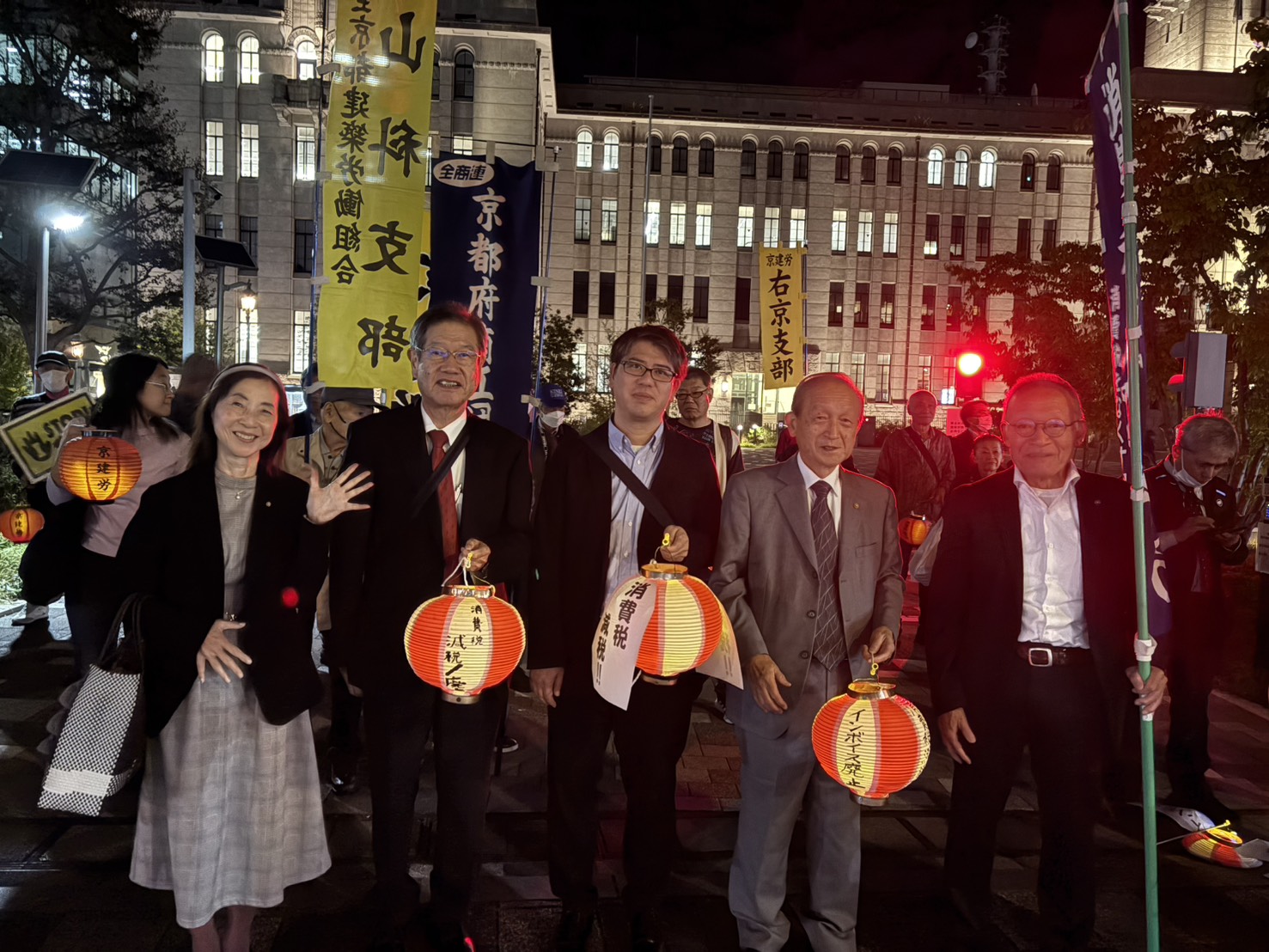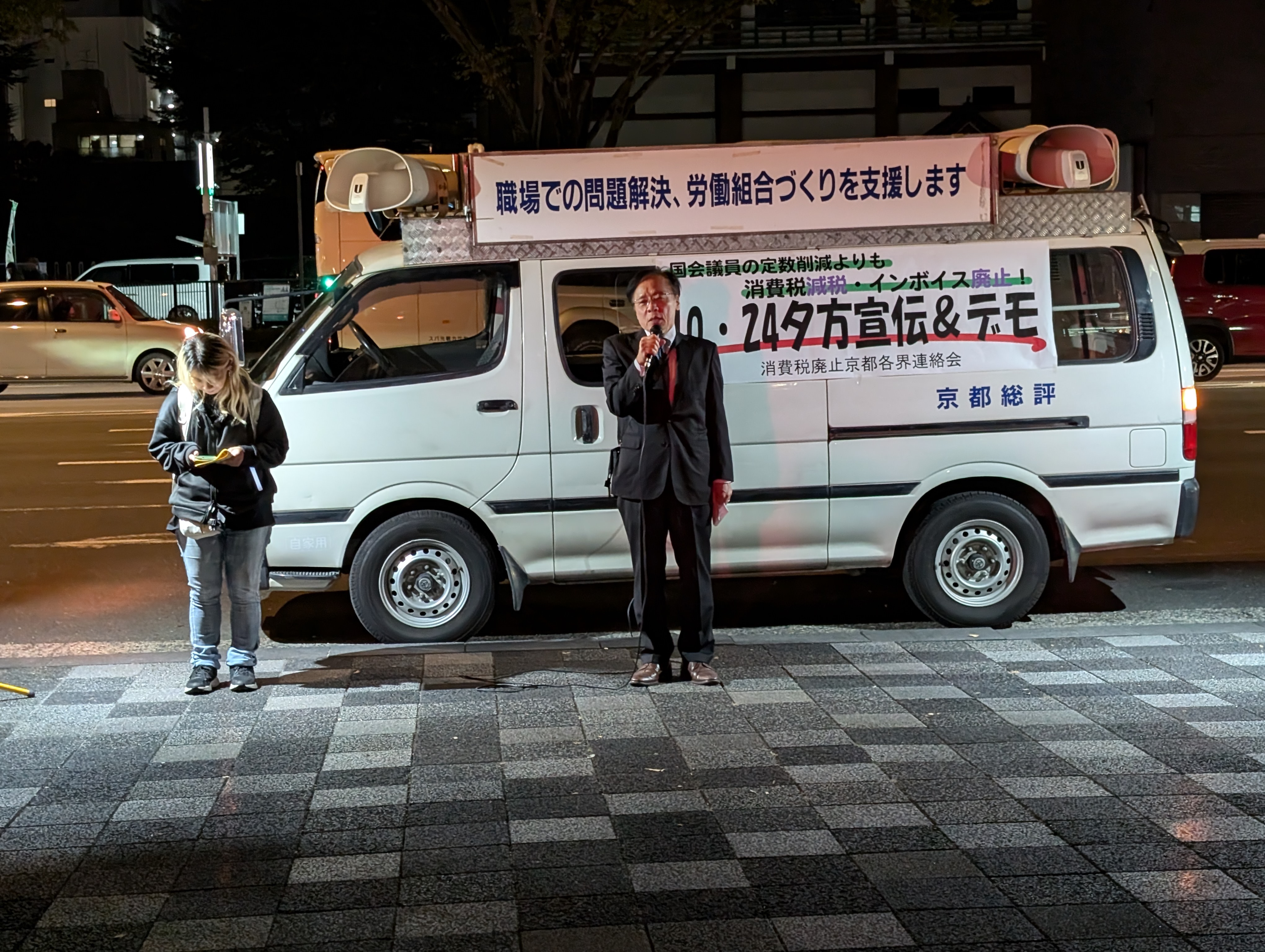 9月議会の山場の中、消費税廃止京都各界連絡会が呼び掛けた、消費税減税・インボイス廃止夕方宣伝とデモに北山議員、蔵田議員、平井議員とともに参加してきました。