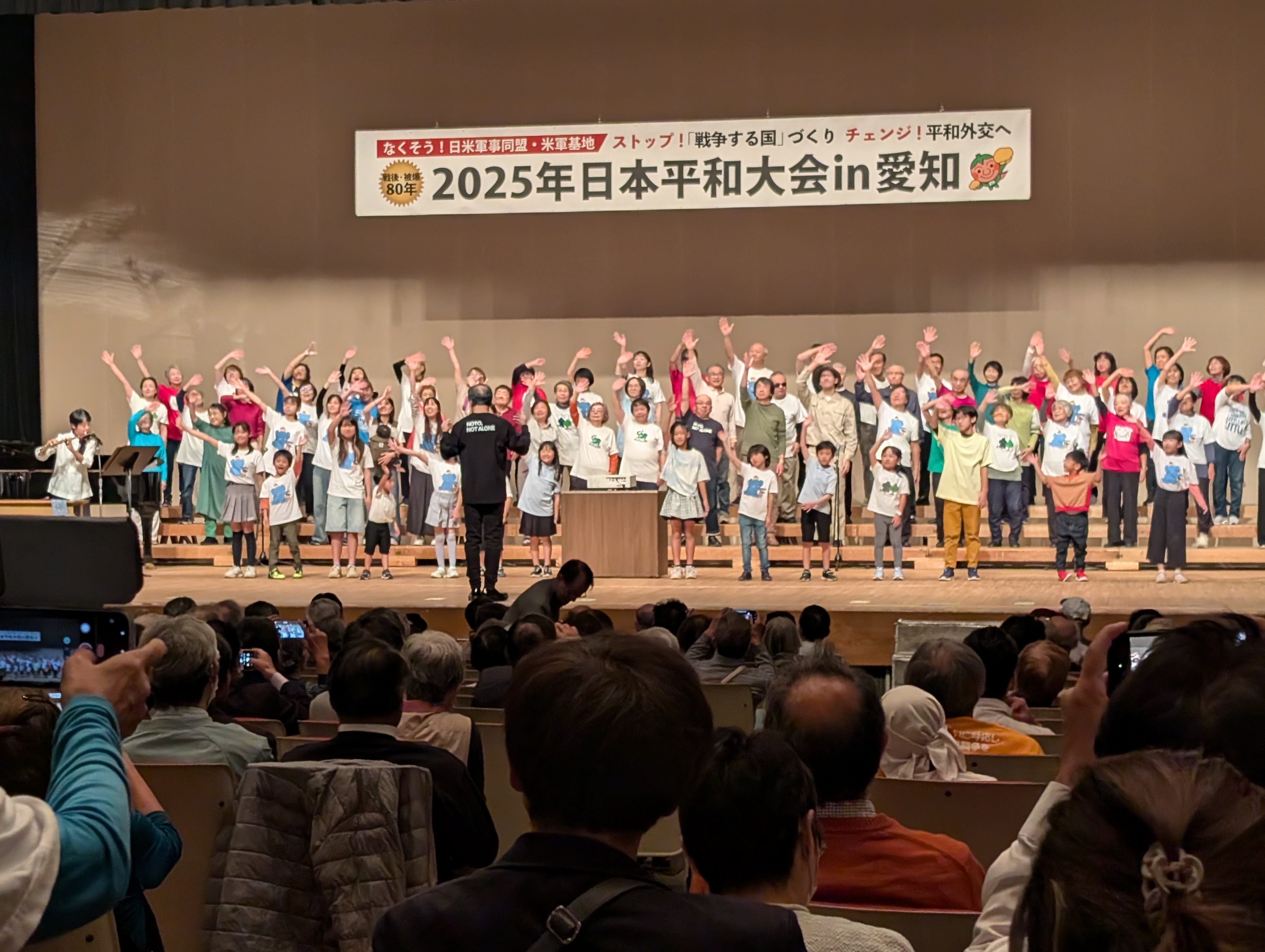 主催者報告では、ロシアによる核脅迫も伴うウクライナ侵攻、イスラエルによるパレスチナ・ガザへのジェノサイド、イスラエルと米国によるイラン攻撃など、二度と戦争はしない、核戦争を起こさせないとの願いが込められた国連憲章と日本国憲法の平和原則が、根本から脅かされていると指摘。