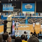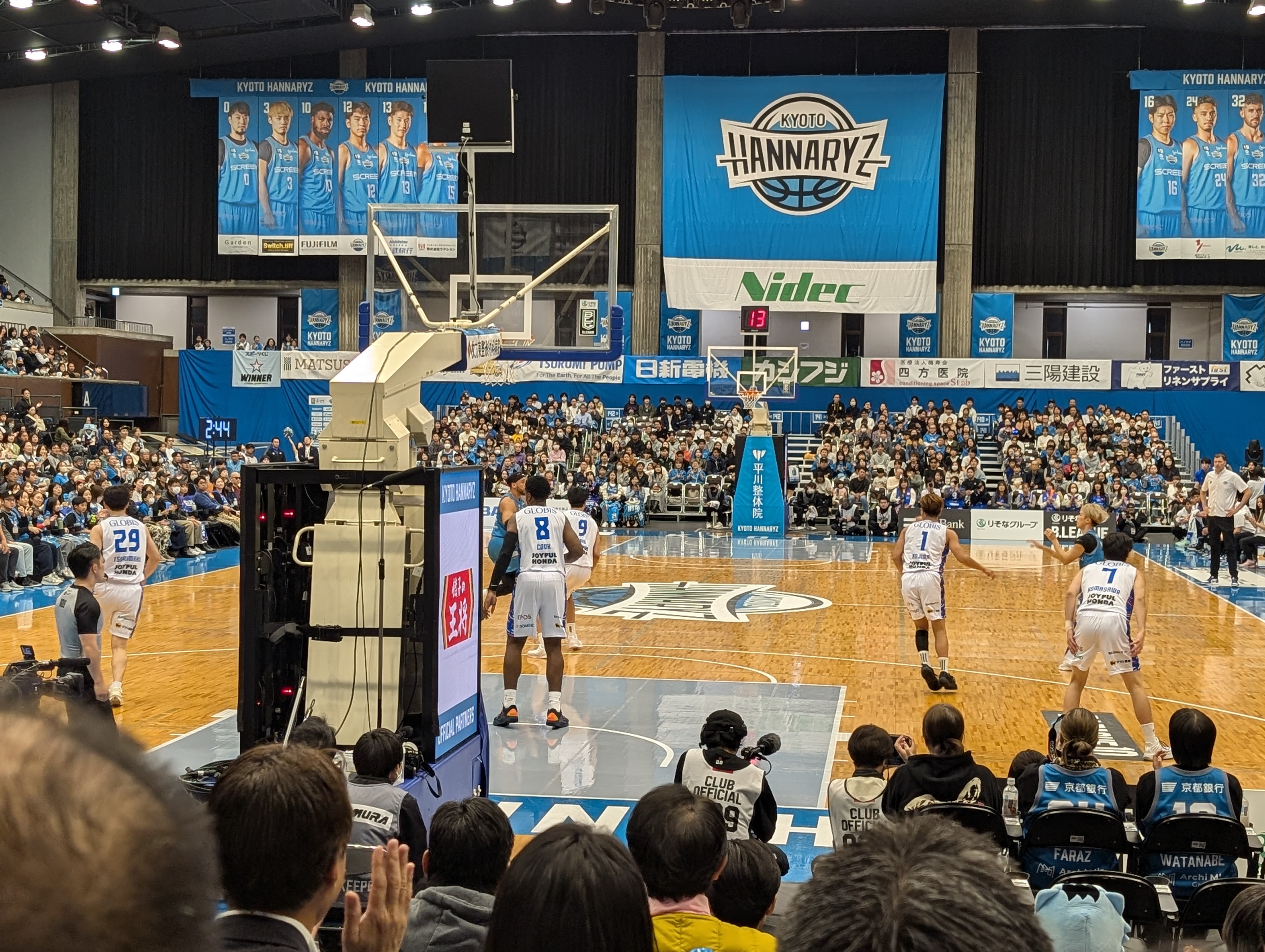 昨日、京都市会超党派でバスケットボール、Bリーグの「京都ハンナリーズ」能胃炎に! 66対63の終了間際、放たれた3ポイントシュートが。終了のブザーと同時にゴールに吸い込まれる「ブザービーター」で66対66に。5分間の延長でも73対75を終了間際に追いつき再延長。結果は87対80の勝利でした。 観戦した場所はゴールボードの後ろの席で、ゴール下のプレイが全く見えませんでした。ゴールボードは天井から吊り下げるようにできないのかな?